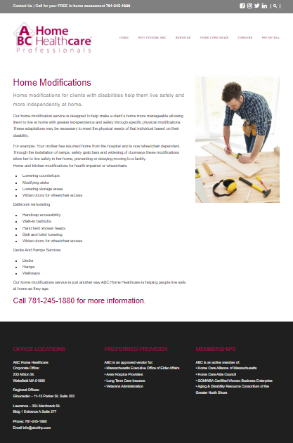 En la página web de ABC Home Healthcare es posible encontrar, en un listado de 15 servicios prestados, el de Home Modifications. El servicio tiene como objetivo hacer del hogar de los clientes más manejable, permitiendo que tengan más independencia y seguridad.